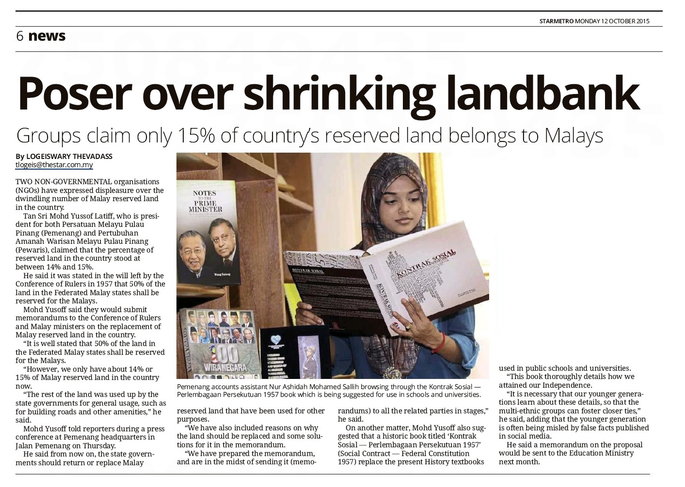 Tan Sri Mohd Yussof Latiff, who is president for both Persatuan Melayu Pulau Pinang (Pemenang) and Pertubuhan Amanah Warisan Melayu Pulau Pinang (Pewaris), claimed that the percentage of reserved land in the country stood at between 14% and 15%.
